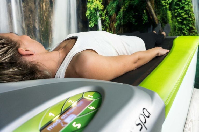 In bequemer Bekleidung auf einer weichen Liegefläche ruhend, begünstigt die medi stream® spa Wasser-Massage-Liege gleichermaßen Gesundheit und